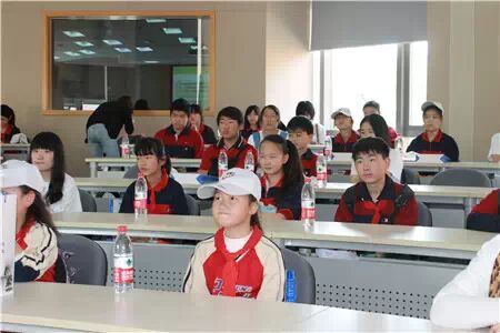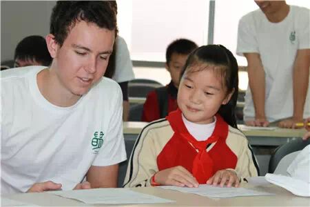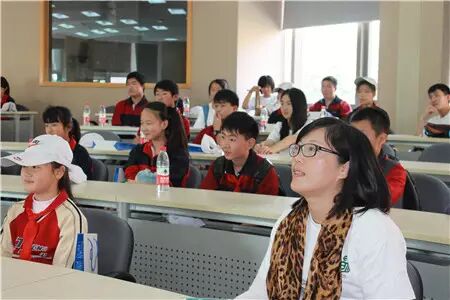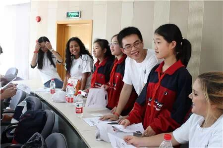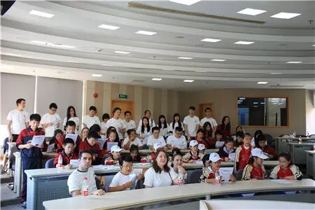 考虑到同学们的年龄相对比较小,我们特别安排了一个学唱英文歌的环节。早早候在门外的来自美国IES Abroad 的留学生志愿者来到教室,饶有耐心地教起歌来。第一首其实是首英文儿歌“row row row your boat”,当欢快的音乐在教室里响起,同学们也从开始的严肃拘谨慢慢放松下来,很快就和志愿者们互动起来了。